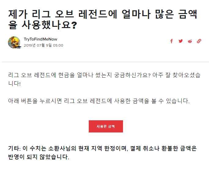 리그오브레전드 고객지원을 가셨다면 거의 다 왔습니다. 일반적으로 문의를통해 알아볼 수 있지만 맨 밑으로 스크롤바를 내리시면 흥미로운글이 있는데요. 필자또한 이곳에서 흥미롭게도 찾게되었답니다. 자주하는 게임이다보니 궁금증이 많고 호기심에 얼마를 썼을까 하는마음에 두번째에 있는 얼마나 많은 금액을 사용했는지가 의문이었습니다.