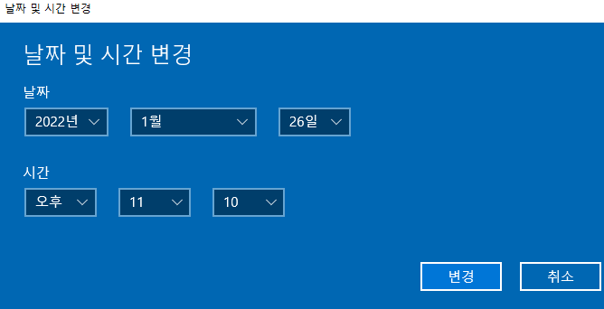 자동으로 시간 설정 체크해제를 하면 수동으로 날짜 시간 설정을 할 수 있도록 활성화가 됩니다.